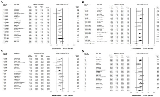 A forest plot illustrating the subgroup analyses of vitamin supplementation in managing chronic pruritus. (A) Effect of treatment duration, (B) disease, (C) route of administration, and (D) different vitamin types. The squares represent the effect sizes, with horizontal lines indicating the 95% confidence intervals. The diamond symbol at the bottom of each panel summarizes the overall effect size.