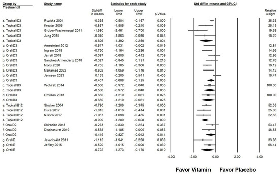 In the advanced subgroup analysis examining different vitamin types and administration routes (Figure 5), topical vitamin D3 (overall effect: −0.826, 95% CI: −1.392 to −0.259, p = 0.004; I2 = 71.683%, p = 0.014) and topical vitamin B12 (overall effect: −0.909, 95% CI: −1.209 to −0.608, p < 0.001; I2 <0.001%, p = 0.714) exhibited the strongest antipruritic effects. Moderate pruritus reduction was observed with topical vitamin B3 (overall effect: −0.506, 95% CI: −0.972 to −0.040, p = 0.033; I2 < 0.001%, p > 0.999), oral vitamin B3 (overall effect: −0.650, 95% CI: −1.219 to −0.081, p = 0.025; I2 < 0.001%, p > 0.999), and oral vitamin E (overall effect: −0.722, 95% CI: −1.273 to −0.170, p = 0.010; I2 = 31.703%, p = 0.226). On the other hand, oral vitamin D2 (overall effect: −0.419, 95% CI: −0.827 to −0.012, p = 0.044; I2 < 0.001%, p = 0.449) and oral vitamin D3 (overall effect: −0.407, 95% CI: −0.688 to −0.125, p = 0.005; I2 = 64.537%, p = 0.010) were associated with a small yet significant reduction in pruritus. These findings suggest that topical applications of vitamin D3 and B12 may be the most effective in alleviating pruritus, while oral vitamin B3, B12, and E also provide considerable benefits. Conversely, oral vitamins D2 and D3, though effective, demonstrated a comparatively weaker impact on pruritus severity.