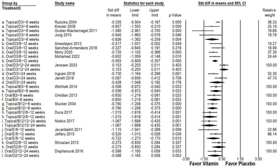 In an in-depth subgroup analysis assessing the effects of various vitamin types, administration routes, and treatment durations (Figure 6), topical vitamin B12 applied for 8–12 weeks (overall effect: −1.015, 95% CI: −1.616 to −0.414, p = 0.001; I2 < 0.001%, p > 0.999) and 12–24 weeks (overall effect: −1.067, 95% CI: −1.698 to −0.435, p = 0.001; I2 < 0.001%, p > 0.999) exhibited a strong antipruritic effect. Likewise, topical vitamin D3 used for less than 8 weeks (overall effect: −0.826, 95% CI: −1.392 to −0.259, p = 0.004; I2 = 71.683%, p = 0.014) resulted in a significant reduction in pruritus severity. Moderate effects were observed with oral vitamin D3 for 8–12 weeks (overall effect: −0.583, 95% CI: −0.809 to −0.357, p < 0.001; I2 < 0.001%, p = 0.645), oral vitamin B3 for less than 8 weeks (overall effect: −0.650, 95% CI: −1.219 to −0.081, p < 0.025; I2 < 0.001%, p > 0.999), oral vitamin E for 8–12 weeks (overall effect: −0.722, 95% CI: −1.273 to −0.170, p = 0.010; I2 = 31.703%, p = 0.226). Additionally, moderate effects were noted for topical vitamin B3 applied for less than 8 weeks (overall effect: −0.506, 95% CI: −0.972 to −0.040, p = 0.033; I2 < 0.001%, p > 0.999) and topical vitamin B12 administered for under 8 weeks (overall effect: −0.790, 95% CI: −1.206 to −0.375, p < 0.001; I2 < 0.001%, p > 0.999). Conversely, oral vitamin D3 administered for 12–24 weeks (overall effect: −0.153, 95% CI: −0.205 to 0.511, p = 0.403; I2 < 0.001%, p > 0.999), oral vitamin D3 was taken for up to 24 weeks (overall effect: −0.428, 95% CI: −1.048 to 0.192, p = 0.176; I2 = 70.980%, p = 0.063), oral vitamin D2 used for 8–12 weeks (overall effect: −0.273, 95% CI: −0.830 to 0.284, p = 0.337; I2 < 0.001%, p > 0.999), and oral vitamin D2 for 12–24 weeks (overall effect: −0.588, 95% CI: −1.185 to −0.009, p = 0.053; I2 < 0.001%, p > 0.999) demonstrated a non-significant effect in reducing pruritus.