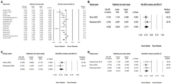 Presents a forest plot that highlights the effects of vitamin supplementation. The plot is divided into four sections for ease of interpretation: (A) shows the effect on skin lesion area, (B) depicts changes in TNF levels, (C) assesses alterations in IL-6 levels, and (D) evaluates the impact on hs-CRP. The horizontal lines extending from the squares represent the 95% confidence intervals, while the diamond symbols indicate the overall effect sizes.