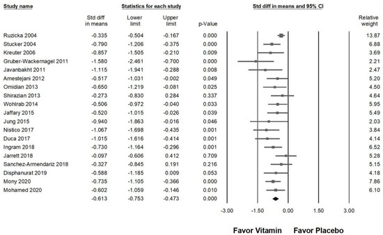 Displays the overall impact of vitamins on chronic pruritus, as measured by the visual analog scale, compared to placebo [7,8,9,10,11,12,42,43,44,45,46,47,48,49,50,51,52,53,54,55].