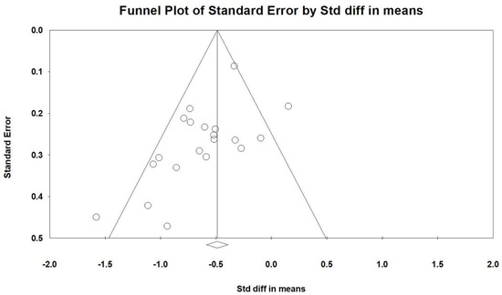 A funnel plot summarizing the findings from all included studies. The diagonal lines represent confidence intervals around the effect estimates, indicating the expected range for the true effect size. Each circle corresponds to an individual study, with larger circles reflecting studies with greater weight or larger sample sizes. The diamond symbol at the bottom represents the overall pooled effect size, with its center indicating the estimated effect and its width denoting the confidence interval.