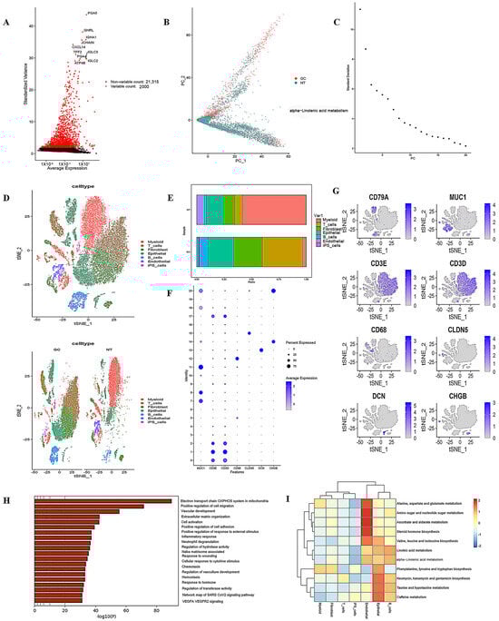 2.3. Tissue Transcriptome and Single-Cell RNA Sequencing, Combined with Metabolomics, Reveal Changes in 1CM-Related Pathways in GC