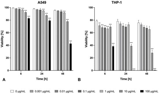 Assessment of cell viability by trypan blue exclusion test of A549 epithelial cells (A) and THP-1 macrophages (B) after exposure to Zn/Cu-containing welding fume particles. Viability of different particle concentrations (0–100 µg/mL) over the exposure time (6 h, 24 h, and 48 h). Each measuring point shows the mean ± SEM for n = 15 (A549) or n = 12 (THP-1). (*) p < 0.05, (**) p < 0.01, (***) p < 0.001.