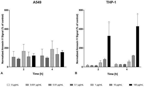 During apoptosis, phosphatidylserine (PS) translocates to the surface of apoptotic cells, where it can be bound by annexin V. The apoptotic response of cells to welding fume particles was studied using annexin V staining in live cell imaging, measured by normalized orange fluorescence (Figure 2). Fluorescent signals were quantified at different exposure concentrations for 2 h and 4 h exposure times for A549 epithelial cells and THP-1 macrophages. In A549 cells (Figure 2A), the applied exposure doses from 0.01 to 100 μg/mL did not induce any significant increases in annexin V. The highest increase was observed at the exposure dose of 1 μg/mL for both time points; at 2 h, there was a 1.87-fold increase, and at 4 h, the increase was slightly higher. At the exposure dose of 100 μg/mL, there was also a moderate increase over time; at 4 h, there was a 1.55-fold increase approaching statistical significance (p = 0.055). In THP-1 macrophages (Figure 2B), the applied exposure doses from 0.001 to 100 μg/mL caused a dose- and time-dependent increase of the annexin V staining. At lower concentrations (0.001–0.1 μg/mL), fluorescence remained near baseline levels (approximately 15–27% of control) across both time points. However, substantial increases were observed at the highest concentration. The 100 μg/mL treatment induced statistically significant elevations of approximately 3.28-fold at 2 h and 4.29-fold at 4 h compared to the control. The time profile showed that the fluorescence intensity in THP-1 macrophages generally increased with extended exposure, with the 4 h values exceeding the corresponding 2 h measurements for equivalent concentrations.