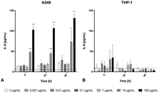 The production and release of IL-6 is presented in Figure 3. The exposed alveolar epithelial cells (A549) showed a clear concentration- and time-dependent increase in IL-6 secretion compared to the control (Figure 3A). The maximal IL-6 releases in A549 cells were already detected after 6 h at a high particle concentration of 10 µg/mL. In comparison, no significant changes in secreted IL-6 levels were found for exposed THP-1 macrophages compared to the control (Figure 3B). Possible interferences of cytotoxicity could be determined for THP-1 macrophages (but not A549 cells) after treatment with concentrations > 10 µg/mL at 24 h and 48 h, which is made evident by the stagnated or decreased trend in IL-6 concentrations (Figure 3B).