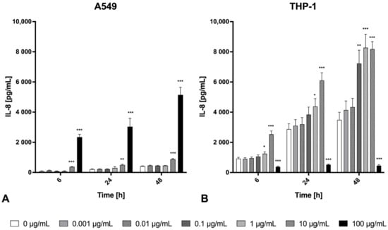 IL-8 release from A549 cells (A) or THP-1 macrophages (B) after exposure to Zn/Cu-containing welding fume particles at different concentrations (0–100 µg/mL) over time (6 h, 24 h, and 48 h). Each bar shows the mean ± SEM for n = 15 (A549) or n = 12 (THP-1). Statistically significant differences between exposed and unexposed cells (*) p < 0.05, (**) p < 0.01, (***) p < 0.001.