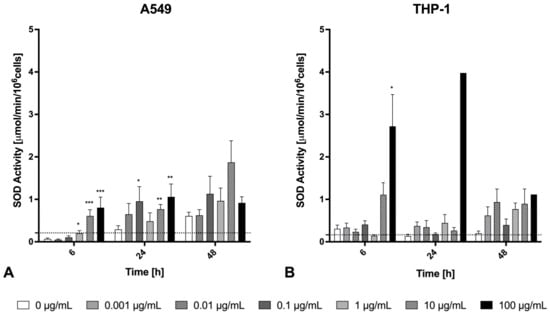 SOD activity in A549 cells (A) or THP-1 macrophages (B) after exposure to Zn/Cu-containing welding fume particles at various concentrations (0–100 µg/mL) over time (6 h, 24 h, and 48 h). Each bar shows the mean ± SEM for n = 4. Dashed lines show the level of the negative control. Statistically significant differences between exposed and unexposed conditions are highlighted as follows: (*) p < 0.05, (**) p < 0.01, and (***) p < 0.001.
