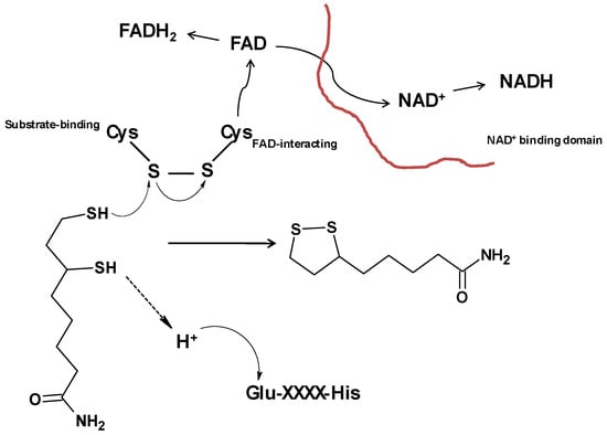 - Hopkins, N.; Williams, C.H. Characterization of lipoamide dehydrogenase from Escherichia coli lacking the redox active disulfide: C44S and C49S. Biochemistry 1995, 34, 11757–11765. [Google Scholar] [CrossRef]