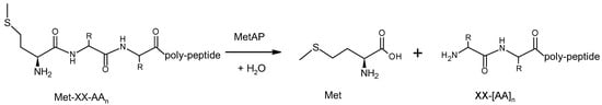 - Giglione, C.; Vallon, O.; Meinnel, T. Control of protein life-span by N-terminal methionine excision. EMBO J. 2003, 22, 13–23. [Google Scholar] [CrossRef]