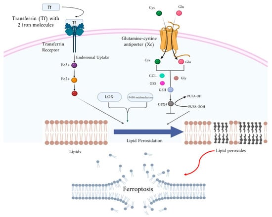 Iron can catalyze ferroptosis both enzymatically and non-enzymatically. Enzymatic catalysis involves facilitating the oxidation of lipids within cells, forming lipid peroxides [120]. Autophagic degradation of ferritin (an iron-storage protein) results in the leakage of free iron (Fe2+) into the cytoplasm, thereby expanding the pool of redox-active iron and enhancing susceptibility to ferroptosis. The overexpression of transferrin receptor 1 (TfR1) enhances the amount of iron that is internalized and enhances susceptibility to ferroptosis [121]. The main factors involved in the process of lipid peroxidation include lipoxygenases and phosphorylase kinase G2 (PHKG2), which regulate the availability of iron required to catalyze the peroxidation of polyunsaturated fatty acids (PUFAs) [122].