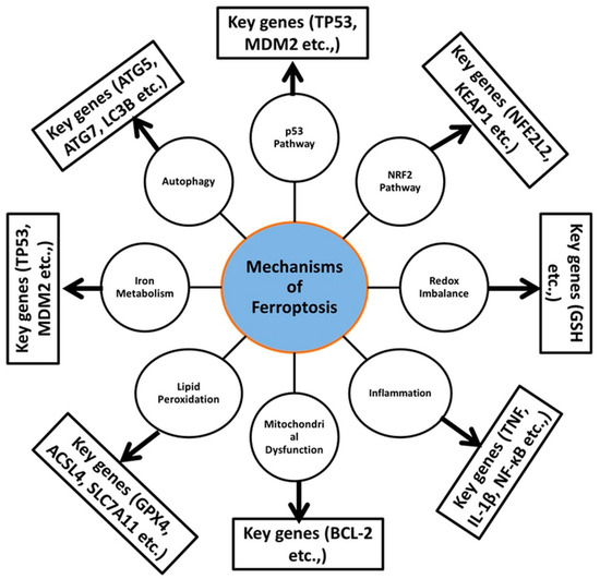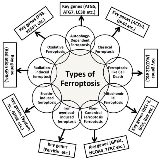 A summary of various types of ferroptosis and their key genes that contribute to ferroptosis cell death [121,122,123,124].