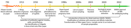 The idea of using paper in the clinical analysis of biologically relevant substances is not new (Figure 1). Isolated historical evidence suggests that blood drops were collected on paper as part of sacrificial rituals as early as 780 AD, as depicted in Mayan murals [1].