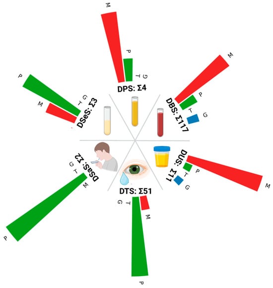 Number of articles in PubMed for each type of biological liquid discussed: G—genomics (blue); T—transcriptomics (yellow); P—proteomics (green); M—metabolomics (red). ∑ indicates the summarized number of articles for each type of biological sample. The search in PubMed was effected using the following queries: for DBS: ((“dried blood spot”[Title/Abstract]) OR (“dried bloodspot”[Title/Abstract])) AND (OMICS[Title/Abstract]); DPS: (“Dried Plasma Spot”[Title/Abstract]) AND (OMICS[Title/Abstract]); DSeS: (“Dried Serum Spot”[Title/Abstract]) AND (OMICS[Title/Abstract]); DTS: ((Schirmer’s Strip)[Title/Abstract] OR (“Dried Tear Strip”)[Title/Abstract]) AND (OMICS[Title/Abstract]); DUS: ((“Urine Strip”)[Title/Abstract] OR (“Dried Urine Strip”)[Title/Abstract] OR (“Dried Urine Spot”)[Title/Abstract]) AND (OMICS[Title/Abstract]); DSaS: (“Dried Saliva Spot”[Title/Abstract]) AND (OMICS[Title/Abstract]).