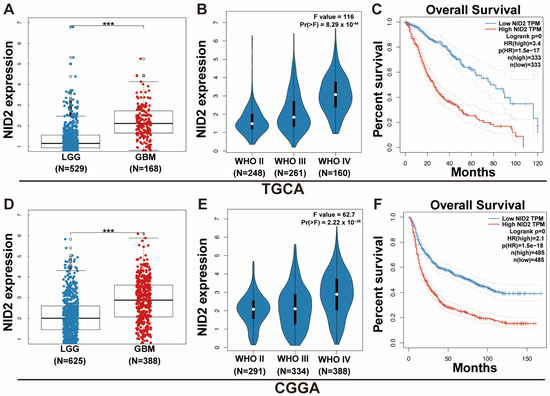Tumor subtypes and clinical outcomes associated with NID2 expression in glioma dataset. (A,D) Wilcoxon rank-sum test was used to analyze the differential expression of NID2 between GBM and LGG in TCGA (A) and CGGA (D). (B,E) Violin plot illustrating NID2 expression in TCGA (B) and CGGA (E) dataset according to the grade. (C,F) Kaplan–Meier survival curves of the TCGA (C) and CGGA (F) cohort showed that a high level of NID2 expression was associated with significantly worse overall glioma survival. WHO II, III and IV, World Health Organization grades II, III, and IV. *** p < 0.001.