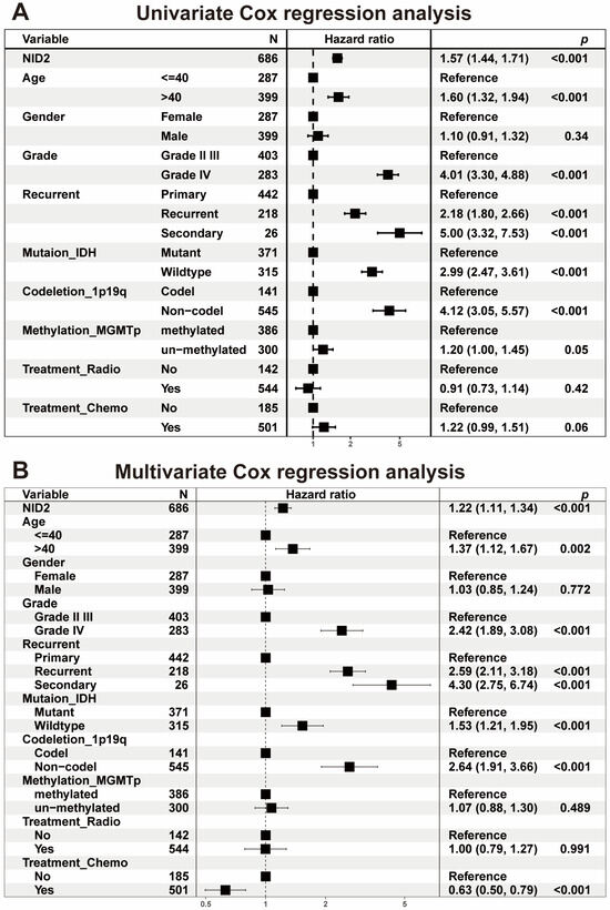 To confirm the findings from TCGA analysis, we analyzed the CGGA glioma dataset, which contains 693 LGGs and 325 GBMs in the Chinese population. Our study showed that NID2 expression was significantly higher in GBM than in LGG (p < 0.001, Figure 2D). The NID2 expression level was also correlated with a higher grade (p < 0.001, Figure 2E) in CGGA. Kaplan–Meier survival analysis showed that high NID2 expression was associated with significantly worse OS (p < 0.0001, Figure 2F). Subgroup analysis showed that NID2 expression negatively impacted patient survival more in LGG than in GBM (HR 1.27 vs. 1.15, Supplementary Figure S5). High NID2 expression was associated with worse OS in IDH-wildtype and IDH-mutant LGG subgroups (p < 0.0001, Supplementary Figure S6). The univariate and multivariate Cox regression analysis revealed that NID2 high expression is an independent adverse predictor for patient survival (HR = 1.23, p < 0.001, Figure 3).