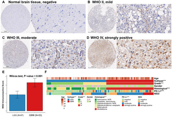 Immunohistochemical staining was performed using standard procedures. NID2 was detected using an anti-NID2 antibody (Santa Cruz Biotechnology, Dallas, TX, USA, sc-373859) at 1:500 dilution according to the manufacturer’s instructions. Briefly, the processed sections were blocked with 5% BSA used for section blocking, and an anti-NID2 antibody was used as the primary antibody incubated overnight at 4 °C. Next. The DAB Detection Kit was used to develop a staining signal, counterstained with hematoxylin, and captured with Leica Aperio VERSA. Normal brain tissue served as the negative control. For tumor tissues, the staining intensity was estimated as negative, weak, moderate, and strong, corresponding to the scores of 0, 1, 2, and 3. The percentage of positive cells was calculated following the criteria: 4, >80%; 3, 51~80%; 2, 10~50%; 1, <10%; 0, 0%. Three independent pathologists blinded to the identity of the sample evaluated the percentage of positive cells and staining intensity. The immunoreactive score (IRS) was calculated by multiplying the staining intensity score (0~3) by the positive cell proportion score (0~4) [45]. Immunoreactivity was determined by using the IRS with the following criteria: negative (0~1), mild (2~3), moderate (4~8), and strongly positive (9~12) [45].
