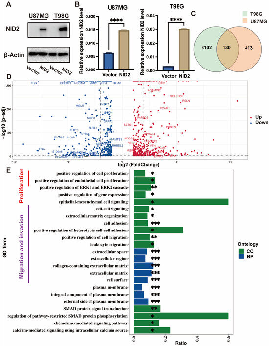 To explore molecular pathways activated by the upregulation of NID2 in glioma cells, we created two stable NID2-overexpressing cell lines using U87MG and T98G cells. We confirmed NID2 overexpression by Western blotting and RT-qPCR assays (Figure 5A,B). RNA-Seq was performed to study transcriptomic changes associated with NID2 overexpression in glioma cells. Upregulated genes in the NID2-overexpressing T98G and U87MG cell lines were analyzed and presented in a Venn diagram, which showed co-regulation of 130 genes in the two cell lines (Figure 5C). DEGs were presented in a volcano plot (Figure 5D). Gene ontology enrichment biological process and cellular component pathway analyses of the DEGs revealed that these genes were clustered into positive regulation of proliferation, positive regulation of endothelial cell proliferation, cell survival, epithelial-mesenchymal cell signaling, cell-cell signaling, ECM organization, cell adhesion, and positive regulation of cell migration (Figure 5E), which are essential pathways for malignant proliferation, EMT modulation, angiogenesis, migration, and invasion associated with glioma oncogenesis and progression.