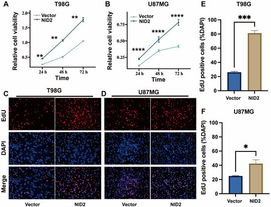 The CCK8 assay results showed that cell proliferation was significantly enhanced in the NID2-overexpressing T98G and U87MG cells compared with the vector controls (Figure 6A,B). The EdU single cell proliferation assay confirmed the result (Figure 6C–F).