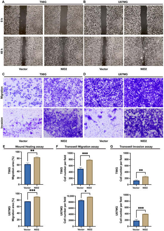 Overexpression of NID2 promoted migration and invasion of glioma cells. (A,B) Wound healing assay showed overexpression of NID2 enhanced glioma cell migration (representative images of wound scratch). (C,D) Overexpression of NID2 promoted the migration and invasion of glioma cells examined by transwell assay. (E–G) Histograms represent the analysis of the wound healing rate (E), migration cell number (F), and invasion cell number (G). *** p < 0.001, ** p < 0.01, * p < 0.05.