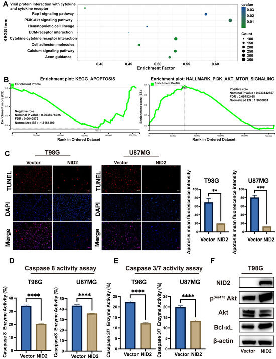 Overexpression of NID2 protected against glioma cell apoptosis. (A) KEGG enrichment analysis of the DEGs between the vector control groups and NID2-overexpressing T98G/U87MG glioma cells revealed significant activation of Akt signaling and extracellular matrix remodeling pathways. (B) GSEA demonstrated that NID2-overexpressing glioma cells exhibited enhanced negative regulation of apoptosis and Akt pathway activation. (C) The TUNEL assay revealed a significant decrease in apoptotic cells in the NID2-overexpressing cells compared to the vector controls (Scale bar: 20 µm). (D,E) Caspase 8 and caspase 3/7 activity assays showed the apoptosis proteins were downregulated in the NID2 overexpression group (n = 8). (F) Western blotting of apoptosis markers in T98G glioma cells. **** p < 0. 0001, *** p < 0.001, ** p < 0.01.