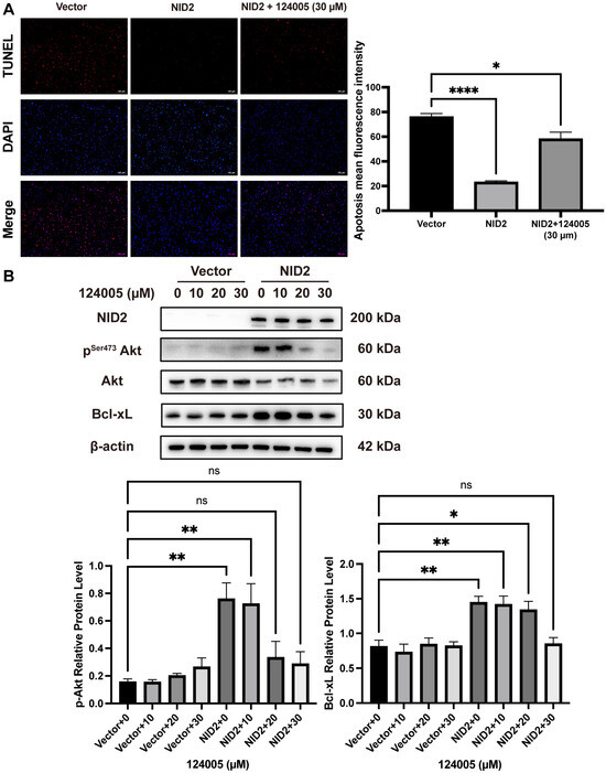 We used a specific signal transduction inhibitor to test the pivotal role of Akt phosphorylation affecting anti-apoptotic signaling in the NID2-overexpressing cells. Akt1 inhibitor 124005 was added in the experimental group and then TUNEL assay and Western blotting were performed. Cell lysates were harvested 18 h after being treated with 10, 20, and 30 µM of 124005 for the analysis of p-Akt, Akt, and Bcl-xL expression. As shown in Figure 9A, the anti-apoptotic effect caused by overexpression of NID2 can be largely reversed by the addition of 30 µM of 124005. As shown in Figure 9B, overexpression of NID2 significantly elevated the protein expression of p-Akt and anti-apoptotic protein Bcl-xL. Meanwhile, treating with 20 µM and 30 µM of 124005 could decrease the expression of p-Akt and Bcl-xL in the NID2-overexpressing cells as compared with the vector controls.