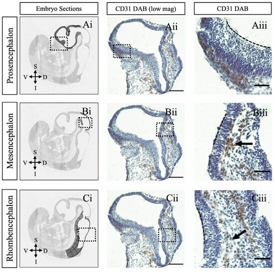 Endothelial precursor cells encompass the neural tube by GD10. Sagittal sections of mouse brain at GD10 immunostained for endothelial cells with CD31. (Ai–Ci) Representative anatomical images from the Allen Developing Mouse Brain Reference Atlas (https://atlas.brain-map.org, accessed on 23 February 2025) []. (Aii–Cii) Low magnification views of highlighted brain regions in (Ai–Ci). (Aiii–Ciii) High magnification views of boxed regions in (Aii–Cii). The perineural vascular plexus (PNVP) encircles the entire brain surface, with a particular emphasis on the alar and caudal regions of the neural tube. Perforating vessels converge to form the subventricular plexus (SVP) within the mesencephalon and rhombencephalon (indicated by arrows), demonstrating a caudal-to-rostral progression in SVP formation. The dashed line marks the boundary between the ventricular lumen and the ventricular surface of brain tissue. GD = embryonic day. Scale bars: (Aii–Cii) 300 μm, (Aiii–Ciii) 1000 μm.