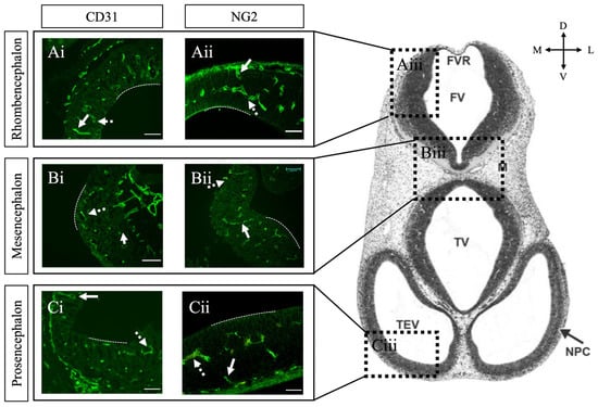 Pericytes invade the brain parenchyma by GD12. Transverse tissue sections of mouse brain at GD12 immunostained for endothelial cells with CD31 and pericytes with NG2. (Ai–Ci) CD31 immunostaining in developing rhombencephalon, mesencephalon, and prosencephalon. (Aii–Cii) NG2 immunostaining in developing rhombencephalon, mesencephalon, and prosencephalon. (Aiii–Ciii) Representative anatomical image of corresponding areas of analysis (Ai–Cii) reproduced with permission from Chen et al. 2017 []. Pericytes are associated with vessels of the PNVP, perforating radial vessels (solid arrows), and SVP (dashed arrows) across all caudal and rostral regions. The dashed line indicates the ventricular surface of brain tissue. GD = gestational day. E = neuroepithelium. FV = fourth ventricle. FVR = fourth ventricle roof. M = mesenchyme. NPC = neopallial cortex. TEV = telencephalic vesicle. TV = third ventricle. Scale bar 50 μm.
