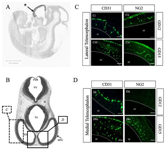 Pericytes are recruited to endothelial cells of the telencephalon in a lateral to medial gradient. (A) Representative sagittal anatomical images of a GD12 mouse embryo denoting the telencephalon * from the Allen Developing Mouse Brain Reference Atlas (https://atlas.brain-map.org, accessed on 23 February 2025) []. (B) Representative transverse anatomical image of GD12 mouse neural tube, with marked regions corresponding to the lateral telencephalon (C) and medial telencephalon (D). Reproduced with permission from Chen et al. 2017 []. (C) Transverse section of GD12 and GD15 lateral telencephalon immunostained for endothelial cells with CD31 (Ci,Ciii) and pericytes with NG2 (Cii,Civ). (D) Transverse section of GD12 and GD15 medial telencephalon immunostained for endothelial cells with CD31 (Di,Diii) and pericytes with NG2 (Dii,Div). In the lateral telencephalon, pericytes are recruited to PNVP and SVP vessels at GD12 and GD15. In contrast, PNVP and SVP vessels of the medial telencephalon (D) lack pericyte coverage at GD12 but show pericyte recruitment by GD15. These results highlight the lateral to medial gradient of pericyte recruitment within the telencephalon. GD = gestational day. FV = fourth ventricle. FVR = fourth ventricle roof. M = mesenchyme. NPC = neopallial cortex. TEV = telencephalic vesicle. TV = third ventricle. LV = lateral ventricle. Scale bar 50 μm.