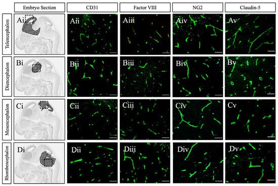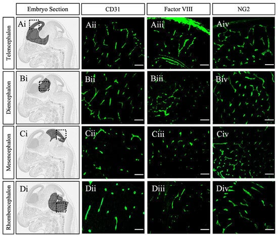 Endothelial cells express Factor VIII by GD15. (Ai–Di) Representative anatomical images of corresponding areas of analysis (highlighted) from the Allen Developing Mouse Brain Reference Atlas (https://atlas.brain-map.org, accessed on 23 February 2025) []. Sagittal tissue sections of GD15 mouse telencephalon, diencephalon, mesencephalon, rhombencephalon immunostained for endothelial cells with CD31 (Aii–Dii), Factor VIII (Aiii–Diii), and pericytes with NG2 (Aiv–Div). Factor VIII is uniformly expressed across all regions, coinciding with positive CD31 and NG2 signals, which demonstrates that the vessels have adopted a mature phenotype by GD15. GD = gestational day. Scale bar 50 μm.