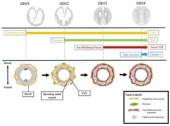 Pregnancy stage-specific sequential acquisition of BBB components in the fetal brain vessels. Endothelial precursor cells assemble into the PNVP to encompass the superficial neural tube by GD10. Radial vessels sprout from the PNVP and extend toward the ventricle of the neural tube, where they grow perpendicularly to form the SVP by GD12. Pericytes are recruited to the vessels of the SVP and PNVP by GD12. At GD15, Factor VIII is expressed in all endothelial cells of both the SVP and PNVP, suggesting that the vessels have adopted a mature phenotype by GD15. Finally, by GD18 the endothelial cells express tight junctions within the SVP and PNVP. Representative anatomical images of mouse brain from the Allen Developing Mouse Brain Reference Atlas (https://atlas.brain-map.org, accessed on 23 February 2025) []. PNVP = perineural vascular plexus. SVP = subventricular plexus. RP = rostral plate. FP = floor plate.