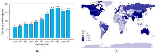 Number of articles published on genomic research of medicinal plants over the past 10 years. (a) Statistics of the number of publications by year. (b) Statistics of the number of publications by country. The visualization was generated using R (version 4.4.1) with the ggplot2 (version 3.5.1), dplyr (version 1.1.4), and cowplot (version 1.1.3) packages.