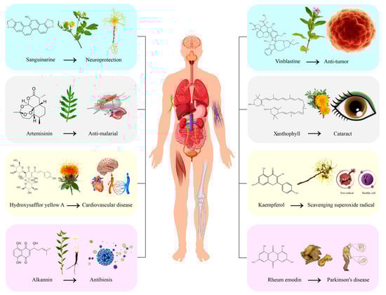 According to their chemical structure and characteristics, plant secondary metabolites can be mainly classified into four categories: alkaloids, terpenoids, phenols, and quinones. These compounds not only serve to protect plants from herbivorous insects and pathogenic bacteria but also have a diverse array of pharmacological activities, including anti-tumor effects, analgesic properties, and treatment for cardiovascular and cerebrovascular diseases, as well as anti-malarial effects (Figure 2, Table 1). Consequently, their applications span across medicine and pharmacy, endowing them with significant economic value and profound social importance.