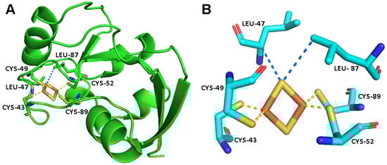 (A) The crystal structure of FDX2 [54]. (B) The metal binding site of FDX2, showing the [Fe2S2]2+ cluster, the iron bond residues and a few additional residues that are in electronic contact with the cluster [58].