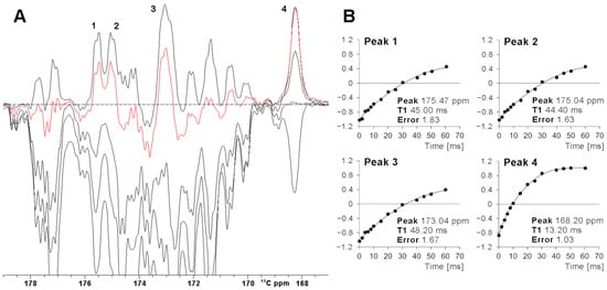 The efficiency of a superWEFT experiment essentially depends on the ratio between the recovery delay τ and the overall recycle delay. For a τ/(AQ+RD) ratio ca. 1, an NMR spectrum where all signals are positive is expected. At decreasing τ values, the inversion recovery gives rise, after the π/2 reading pulse, to positive signal intensity for fast relaxing signals and negative/near zero signal intensity for slow relaxing ones. This is evident in Figure 3A, where a superWEFT experiment was recorded initially with a recycle delay of 110 ms and a τ delay of 70 ms and then repeated at shorter τ delays. The series of experiments show that, for a 45 ms τ delay, only four signals (labeled 1–4 in Figure 3) remain positive, with unaffected or only minimally affected intensity. The fitting of the inversion recovery profile of these four signals permits us to precisely quantify the T1 of signal 4 at 13.4 ms and to obtain for the T1 values of signals 1–3 lower-limit values of 50 ms (signals 1–2) and 60 ms (signal 3). Consistently, the X-ray structure of FDX2 shows that Cys 49 C’ is the only carbonyl atom at 4.1 Å from the Fe3+, with the metal-to-carbon distance for the other C’ spins being ≥ 4.4 Å. The choice of the total recycle delay (AQ + RD) of superWEFT defines the range of T1 values that can be quantitatively measured with this experiment. Signals with 5∙T1 < RD are measured under “almost” steady state conditions, and, therefore, the rate constant of the inversion recovery profile will give the longitudinal relaxation times. On the other hand, signals that relax slower than the above limit will be partly saturated during the superWEFT, such as in the cases of signals 1–3 in Figure 3. Consequently, the rate constant obtained by the fitting is only a lower-limit estimate of the effective T1 values of the signals, as shown in Figure 3B.