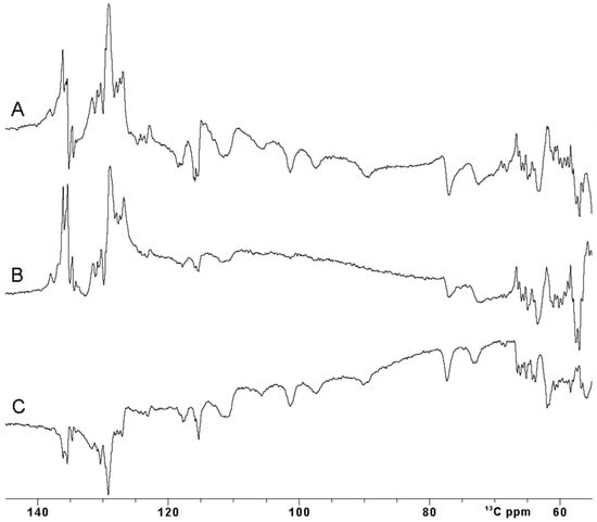 Comparison between 13C IR experiment performed with different inversion π pulses on oxidized [Fe2S2] FDX2. (A) A rectangular (Squa.100) pulse, (B) shaped (Q3.1000) pulse and (C) optimal control (SURBOP180) pulse [59,60]. The inter-pulse delay was 20 us. All the spectra were properly phased using both zero and first-order phase correction. Baseline correction was not applied.