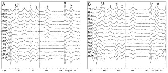 The paramagnetic 13C spectrum shows that signals a’ and h’ are overlapped with diamagnetic signals, and therefore, their T1 values cannot be accurately measured [58]. On the other hand, signals a–h resonate in a region where they are not hampered by diamagnetic spectral crowding. At variance with the carbonyl situation, all these signals are affected by paramagnetic relaxation to a larger extent. Thus, one can use superWEFT to obtain the inversion recovery curve and quantitatively measure T1 values, provided that paramagnetic relaxation rates can be used as structural restraints. Complete inversion recovery series are shown in Figure 5. For comparison purposes, two inversion recovery series using OC inversion pulses and rectangular inversion pulses were performed. T1 values and line widths are summarized in Table 1. The errors on the measured T1 values are below 15%, except for the two fastest relaxing signals, c and f, which display a 20% error. Within the uncertainty, the two series prove the same values of T1. The only signal that provides a different T1 value in the two series is signal c, which is the broadest peak of the spectrum. As observed from the spectra recorded at a very short τ delay, the OC inversion pulse is less efficient than the rectangular pulse, with the restriction that the signal falls within the very narrow excitation region of the rectangular pulse. This shows that, although the OC pulses are substantially more robust in covering a wider spectral region than shaped pulses, relaxation during the pulse is not compensated. Moreover, the possibility to properly irradiate a 24 kHz bandwidth enabled us to properly measure the T1 values of all the paramagnetic signals in a single set of experiments, shortening the overall experimental time.