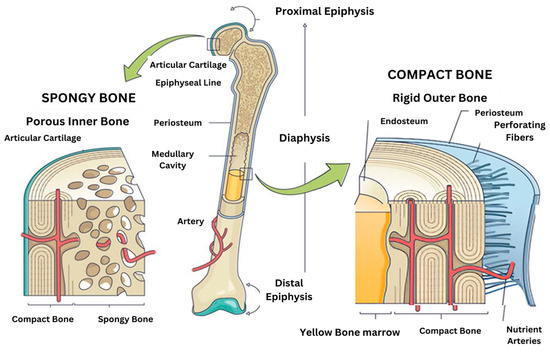 The bone matrix is made up of several key components, including organic proteins (primarily type I collagen), and inorganic minerals like hydroxyapatite, and a variety of extracellular matrix proteins that help regulate bone remodeling and regeneration. Bone mineralization is a complex process that begins with calcium-phosphate-loaded vesicles inside cells, which are thought to serve as precursors for the formation of carbonated hydroxyapatite. This intricate system ensures the strength, structure, and adaptability of bones [1]. Bone minerals are connected to the organic matrix through protein-bound phosphate bonds [7]. These bonds are an integral part of both the structural organic matrix and the inorganic calcium phosphate crystals, creating a strong and cohesive framework that supports bone strength and function. The cellular composition of two microenvironments (spongy bone and compact bone) are different in Figure 1. Despite extensive research, some aspects of the composition and structure of mature bone mineral particles remain unclear. These particles are often described as calcium-deficient and hydroxyl-deficient carbonated hydroxyapatite, with some of the PO43− lattice sites occupied by HPO42− ions. Using advanced solid-state nuclear magnetic resonance techniques, researchers have closely examined the hydrogen-bearing components in bone minerals, particularly focusing on the presence of HPO42− ions, to gain deeper insights into their role in bone structure [3].