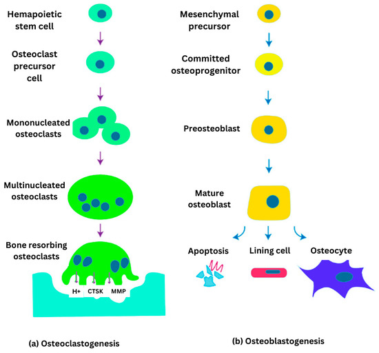 Illustration of bone cell differentiation: (a) osteoclastogenesis from hematopoietic stem cells leading to bone resorbing osteoclasts; and (b) osteoblastogenesis from mesenchymal precursors forming mature osteoblasts which further differentiation into lining cells or osteocytes.