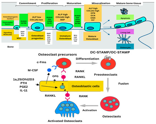 Regulation of bone formation and resorption: the upper panel illustration osteoblast differentiation and maturation, while the lower panel depicts osteoclastogenesis regulated by signaling molecules RANK/RANKL interaction and osteoblastic cell mediation.