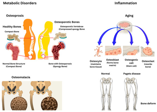 Pathological changes in the intraosseous environment caused by metabolic bone diseases like osteoporosis, osteomalacia, and Paget’s disease result in specific alterations in bone mass, structure, and turnover as presented in Figure 6. Osteoporosis is marked by a reduced bone mass and compromised bone microarchitecture, which increases bone fragility and the risk of fractures [47]. Osteoporosis arises from an imbalance between bone resorption and formation, where osteoclastic activity exceeds osteoblastic activity, leading to a net loss of bone mass [48]. Similarly, osteomalacia stems from the defective mineralization of newly formed osteoid, resulting in softened bones and the development of characteristic loose zones. This condition can arise from nutritional deficiencies, genetic disorders such as X-linked hypophosphatemia, or other metabolic abnormalities [49]. Furthermore, Paget’s disease is characterized by excessive and disorganized bone remodeling, involving heightened osteoclast-mediated resorption followed by compensatory osteoblastic activity, ultimately leading to structurally compromised bone [50].