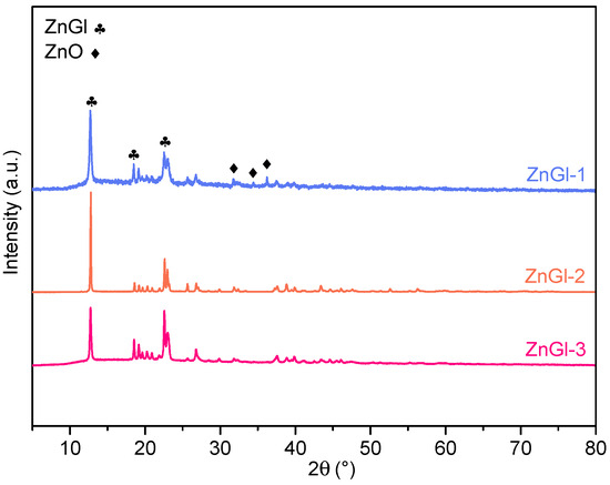 A set of five polypropylene carbonate (PPC) materials was synthesized through the copolymerization of CO2 and propylene oxide in the presence of a zinc glutarate catalyst in a batch reactor at 80 °C and 40 bar CO2 for 20 h. Three zinc glutarate catalysts were utilized: the first two are based on a patented procedure developed by the authors [29] (with the two catalysts, ZnGl-1 and ZnGl-2, differing slightly in the nature of the zinc precursor from which they were prepared) and the other was inspired by the literature [30] (ZnGl-3). Characterization of the three catalysts by XRD indicated that they all present the diffraction pattern of zinc glutarate, though ZnGl-1 also contained a small fraction of unreacted ZnO (Figure 1). The highest activity in the synthesis of PPC was achieved with one of the catalysts inspired by the patent procedure (ZnGl-1, reaching a productivity = 2.17 gPPC/(gcat∙h), compared to 1.86 gPPC/(gcat∙h) for ZnGl-3 under the same conditions). However, rather than on the catalytic performance, the focus of this work is on the properties of the prepared PPC materials. In this context, we chose to test different zinc glutarate catalysts to investigate to what extent their features would affect the properties of the obtained polymers. Our results show that the nature of the zinc glutarate catalyst is not the main factor determining the differences in physicochemical and thermal properties observed among the produced PPC materials (compare the data in Table 1 for the three polymers prepared with ZnGl-1 to those for the polymers synthesized with ZnGl-2 and ZnGl-3). On the other hand, we observed that, as a function of the storage time of the catalyst and of the propylene oxide used as reactant, the presence of adventitious water (in the catalyst or in the epoxide), the scale of the reaction, and the purification method, the properties of the PPC materials can differ in terms of content of residual cyclic propylene carbonate (CPC) by-product, percentage of ether linkages in the polycarbonate backbone, and molecular weight (weight-average molecular weight, Mw; number-average molecular weight, Mn; polydispersity index, D) (see Table 1) [30]. It is worth noting that the prepared products contain a significant fraction of CPC, which can act as a plasticizer and thus have a relevant effect on the properties of the polymers, in particular with regard to the stiffness at room temperature and the glass transition temperature [31,32]. All the PPC materials in this work were purified to remove CPC and the catalyst. It was observed that it is possible to minimize the residual CPC content after purification by pouring the reaction mixture more slowly into the HCl/MeOH solution (see Section 3. “Methods”) and by cutting the purified polymer into small pieces and sonicating it repeatedly in MeOH. With these optimized conditions, a polymer with high purity (>99.5%, as determined by 1H NMR) was obtained in the materials labelled as PPC100 and PPC103.