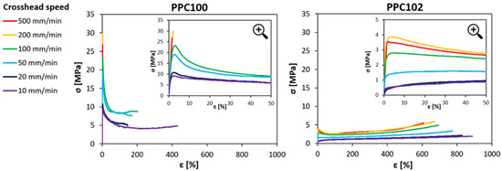 The mechanical behavior of the PPC materials was characterized at room temperature under tensile conditions. Since thermal analyses revealed that the PPC materials undergo a glass transition close to room temperature, the implications of the material’s viscoelastic response were regarded with special consideration. Therefore, the effect of the strain rate on the mechanical properties was explored by carrying out the tests at different crosshead speeds, between 10 mm/min and 500 mm/min (corresponding to strain rates between 2.8·10−3 s−1 and 1.4·10−1 s−1). Examples of tensile stress-strain curves at various strain rates are reported in Figure 3 for two PPC samples selected to show the most evident differences in mechanical behavior, one appearing as the most ductile (PPC102) and the other one being the least ductile (PPC100). Three types of behavior can be observed:
