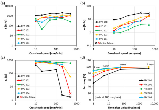 Young’s modulus (a), failure stress (b), ultimate tensile strain (c), and strain recovery (d) for various PPC batches and various crosshead speed values. Strain recovery is reported over time for a crosshead speed of 100 mm/min.