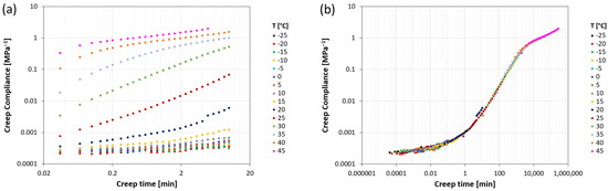 (a) Isothermal creep compliance curves at various temperatures for PPC104; (b) creep compliance master curve representation obtained by superposition of the isothermal curves at a reference temperature T0 = 20 °C.