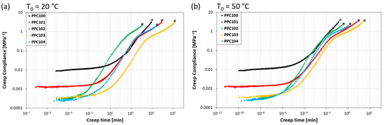 Creep compliance master curves for all PPC systems at reference temperature (a) T0 = 20 °C and (b) T0 = 50 °C.