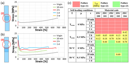 Examples of stress-strain curves obtained by single-lap shear tests after different self-healing times: (a) tests ending with failure type (2), i.e., detachment of the overlapped layers (PPC104 self-healed at Troom and 0.3 MPa); (b) tests ending with failure type (3), i.e., effective self-healing and yielding outside of the overlapped region (PPC104 self-healed at 50 °C and 0 MPa). Each set of curves is accompanied by a schematic representation of the failure type and compared with the stress-strain curve of virgin PPC104 for the same crosshead speed of single-lap shear tests. (c) Maps of the failure type for specimens joined under various conditions of temperature (T), pressure (p), and time (t) [red: type (1), i.e., no attachment of the two surfaces; yellow: type (2), with indication of the adhesive strength τadh, in MPa; green: type (3)].