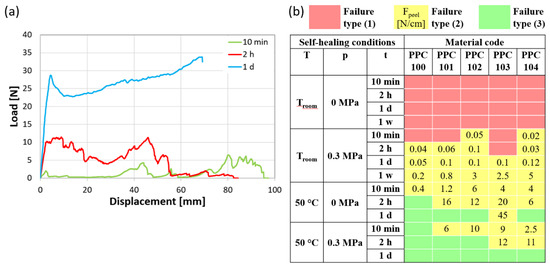 Figure 8b presents a map that summarizes the T-peel test results for the different PPC systems under each set of self-healing conditions, utilizing a color code to indicate the type of failure [red for failure type (1), yellow for failure type (2), and green for failure type (3)], and indicating the peeling force per unit width when adhesive failure occurred.