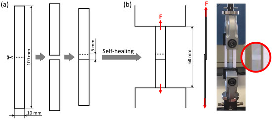 Single-lap shear tests were used to evaluate the self-healing ability of rectangular specimens in a single-lap joint configuration. In order to obtain single-lap joint specimens, rectangular strips (width: 10 mm; overall length: 100 mm) were first cut into two halves, and then joined again by overlapping the specimen halves over a 5 mm-long region, as illustrated in Figure 9a. The self-healing of the specimens was promoted under various conditions (see Table 4): at room temperature (Troom: ca. 23 °C), for times between 10 min and 1 week, by simply maintaining the two halves in contact (pressure on the overlapped region: 0 MPa) or by applying a load (1.6-kg steel block applied on an overlapped region of 10 mm × 5 mm; pressure on the overlapped region: about 0.3 MPa); at 50 °C, for times between 10 min and 1 day, with a pressure of 0 MPa or 0.3 MPa on the overlapped region. The samples were finally tested under tensile conditions in an electromechanical dynamometer (Instron 3366, Norwood, MA, USA) with a gauge length of 60 mm, at a crosshead displacement rate of 50 mm/min, and at room temperature, as illustrated in Figure 9b. For each test, it was evaluated whether the specimen breaks by adhesive failure (detachment of the two overlapped surfaces) or undergoes elongation up to large strains, which would indicate the restoring of a level of structural integrity allowing it to fully withstand tensile stress without undergoing failure in the joint region. By carrying out the tests at different times after overlapping the specimen halves, it was also possible to quantify the time required to achieve such a level of self-healing. In addition, for specimens undergoing adhesive failure, the adhesion strength of the two overlapping surfaces was evaluated as follows: