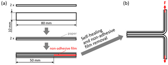 The self-healing abilities were also evaluated in a T-peel configuration, with the specific aim of evaluating the adhesion achieved between overlapped PPC surfaces after self-healing. The specimens were obtained as shown in Figure 10a: two rectangular strips (width: 10 mm; overall length: 80 mm) were first attached to a paper substrate on one side (by means of double-sided tape), and then placed in mutual direct contact on the other side over a 50 mm-long region, separating them by a non-adhesive TeflonTM film for the remaining 30 mm length. Also in this case, self-healing in the overlapping region was promoted under various conditions (see Table 4): at room temperature (Troom, ca. 23 °C), for times between 10 min and 1 week, with a pressure of 0 MPa or 0.03 MPa (1.6 kg steel block applied on an overlapped region of 10 mm × 50 mm); at 50 °C, for times between 10 min and 1 day, with a pressure of 0 MPa or 0.03 MPa. Finally, the two non-adhered extremities were clamped in the electromechanical dynamometer (Instron Mod. 3366, Norwood, MA, USA) and pulled apart with a crosshead displacement rate of 50 mm/min at room temperature, as illustrated in Figure 10b. Importantly, the paper substrate provided structural stiffness to the clamped extremities, thus avoiding their deformation and allowing us to consider these experiments as peeling tests in which the load measured by the dynamometer corresponds to the force required to separate the two adhered extremities. The force necessary to peel a unit-width specimen was evaluated as follows: